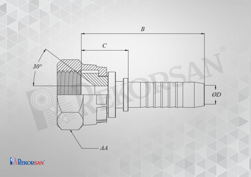 | MALZEME KODU MATERIAL CODE | HORTUM ÖLÇÜSÜ HOSE SIZE | SOMUN ÖLÇÜSÜ NUT SIZE | B | C | ØD | AA | |