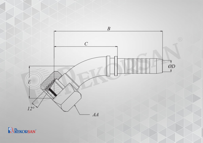 | MALZEME KODU MATERIAL CODE | HORTUM ÖLÇÜSÜ HOSE SIZE | SOMUN ÖLÇÜSÜ NUT SIZE | B | C | E | ØD | AA | |