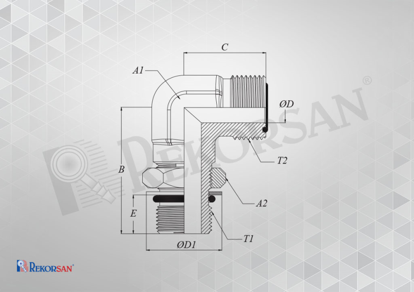 | MALZEME KODU MATERIAL CODE | DİŞ ÖLÇÜSÜ THREAD SIZE T1 (UNF) | DİŞ ÖLÇÜSÜ THREAD SIZE T2 (ORFS) | B | E | C | ØD | ØD1 | A1 | A2 |