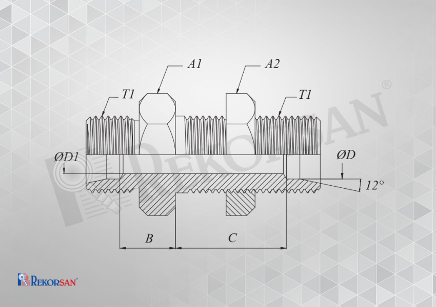 | MALZEME KODU MATERIAL CODE | DİŞ ÖLÇÜSÜ THREAD SIZE T1 | DİŞ ÖLÇÜSÜ THREAD SIZE T1 | B | C | ØD | ØD1 | A1 | A2 |