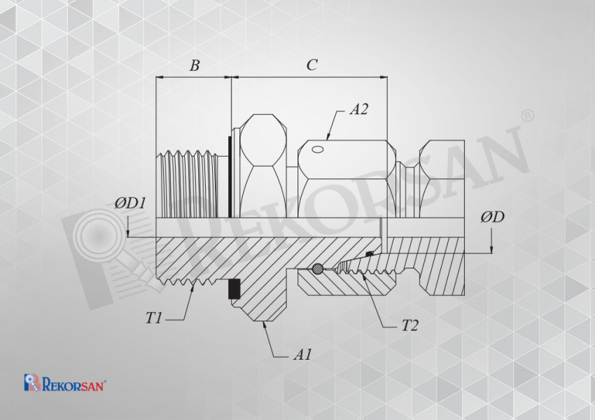 | MALZEME KODU MATERIAL CODE | DİŞ ÖLÇÜSÜ THREAD SIZE T1 | DİŞ ÖLÇÜSÜ THREAD SIZE T2 | BORU ÇAPI TUBE OD ØD | C | B | ØD1 | A1 | A2 |